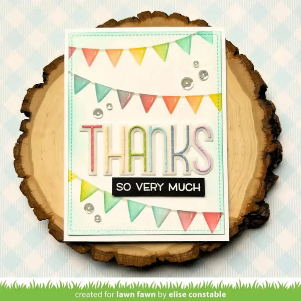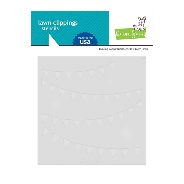 Lawn Clippings Stencils - Bunting Background. Create a background draped with bunting-style banners with this stencil. This set comes with two layers; one for your bunting flags and the other for adding colour to your strings and fun starburst accents. This stencil works well with a variety of crafty techniques. Includes 2 stencils. Size: 6"x 6" (15cm x 15cm).