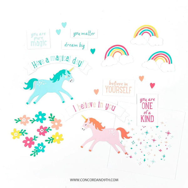 Concord & 9th Clear Stamps 4"X6" - Magical Day - This 18 piece clear photopolymer stamp set from Concord and 9th is full of amazing images and techniques to make crafting with this set so much fun. This Magical Day stamp set features two phrases on four different stamps that can be stamped in two different colours to complete the phrases "Have a Magical Day" and "I believe in you". There is a mini turnabout stamp included for added fun, with the jig included in the packaging. There are also five other sentiments, rainbow arches, and pieces to the unicorns that are in the coordinating die set, Magical Day (C11308, sold separately). These stamps adhere to acrylic blocks and can be used with your favourite inks, markers, embossing powders, and other crafting mediums (sold separately). These stamps can be used for cards, scrapbook pages, tags, journal and planner pages, and other paper crafting and mixed media projects. The largest stamp measures 2.5" x 2.75" and the smallest stamp measures 0.18" x 0.18". This stamp set is made in the USA.