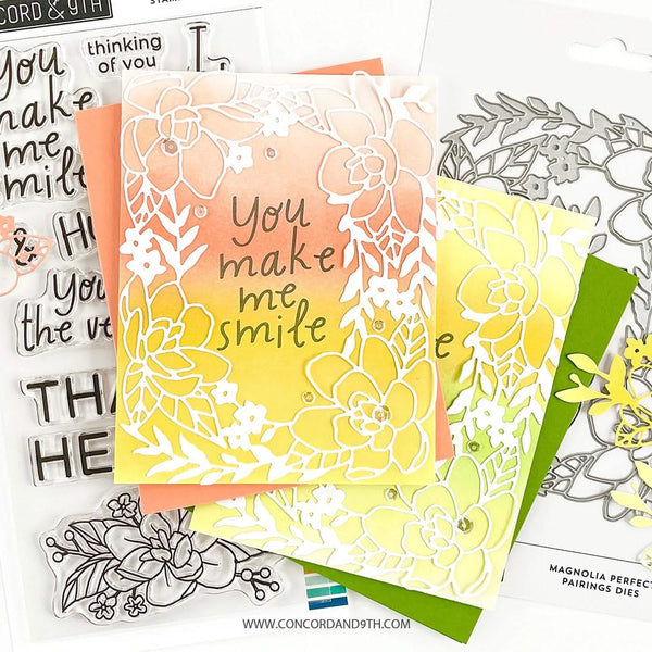 Concord & 9th Clear Stamps 4"X8" - Magnolia Messages - This 11 piece clear photopolymer stamp set, Magnolia Messages, is from Concord & 9th. This stamp set includes a magnolia flower and 10 sentiments. These stamps adhere to acrylic blocks and can be used with your favourite inks, markers, embossing powders, watercolours, coloured pencils, and other crafting mediums (sold separately). These stamps can be used for cards, scrapbook pages, tags, journals, planners, and other paper crafting and mixed media projects. The largest stamp measures 3.31" x 1.87" and the smallest stamp measures 0.43" x 0.62". This stamp set has a coordinating die set, Magnolia Perfect Pairings (C11334, sold separately). This stamp set is made in the USA.