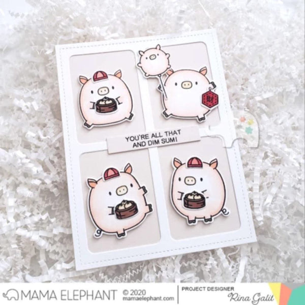 Mama Elephant Stamps - Zodiac Pig. The Zodiac Pig stamp set includes 4 adorable pig images and accessories. The coordinating creative cuts (not included) provides a slit for holding accessories. Use these images for your Lunar Year Celebrations or for any occasion!