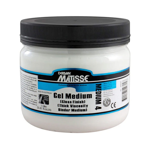 Matisse Acrylic Medium MM4 - Gel Medium 1L (Gloss Finish). Add brilliance and transparency to your acrylic paintings with the Gel Medium by Matisse. The purpose of the MM4 Gel Medium is to act as a clear transparent colour extender in producing brilliant coloured glazes and as a transparent impasto for thick 3-dimensional brush and knife applications of Matisse Structure. Its prime requirement is to be thick and buttery whilst remaining fully transparent. MM4 Gel Medium is perhaps the most versatile medium in the Matisse range because of its multiple effects, particularly when intermixed with other mediums. MM4 Gel Medium dries to a glossy finish. Matisse artist's acrylic colours are designed to dry with a subdued low sheen. Liberal additions of MM4 Gel Medium to Matisse paint will tend to increase the gloss level of the finished work.