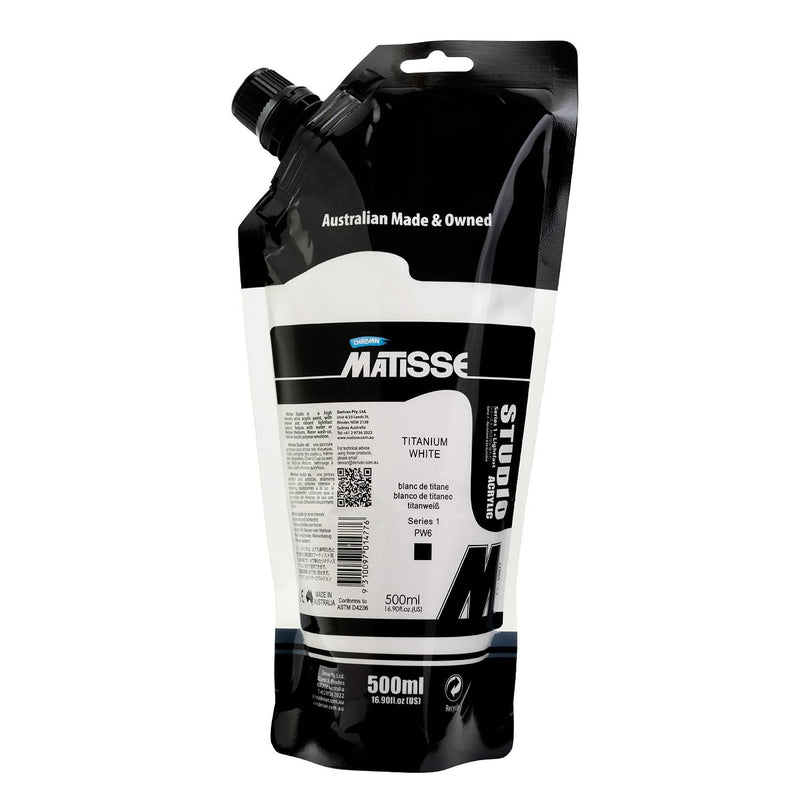 Unmatched in brightness, strength, and safety, Matisse Studio Acrylic Paint - Titanium White, Series 1, is the essential white for every artist. Composed of pure titanium dioxide (PW6), this opaque, ASTM I lightfast pigment delivers maximum coverage, clean mixes, and enduring brilliance.