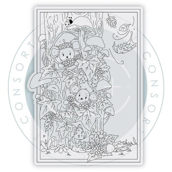 Craft Consortium Photopolymer Stamp set Mice Tree, Tales From Oak Wood - A premium clear photopolymer stamp. With protective acetate film printed with outline references. Largest Stamp Approx: 5" x 3.6" / 12.7cm x 9cm Made in the UK.