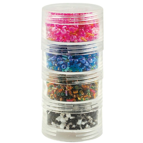 Bead Storage Screw-Stack Canisters 1.875 inch X1 inch 4 pack - Screw-Stack Canisters. Store all kinds of beads and baubles in these clear plastic storage jars. They have a convenient screw-together design where the base of one acts as the lid of another making once compact unit. A single lid is included for the uppermost container. Each individual jar has a diameter of 1-7/8 inches, a depth of 3/4 inch, and will hold approximately 1.1 ounces. This package includes four empty containers and one lid.