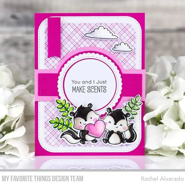 My Favorite Things Die-Namics Dies - Blueprints 31. Blueprints: The Foundation for Your Creativity. Blueprints 31 includes so many mix-and-match opportunities! Two large stitched rounded rectangle panels can be used solo, are layered for extra depth and contrast. The circular frame element coordinates with our Shaker Pouches to create seamless shakers with ease. Use the edge-only die to create a coordinating mat or shaped card edge for the frame and complete your look with the included sentiment strips and accent flag. This set has been modified to eliminate extraneous tab dies. The dies are compatible with most die-cutting machines (sold separately). (7) piece set. Size: