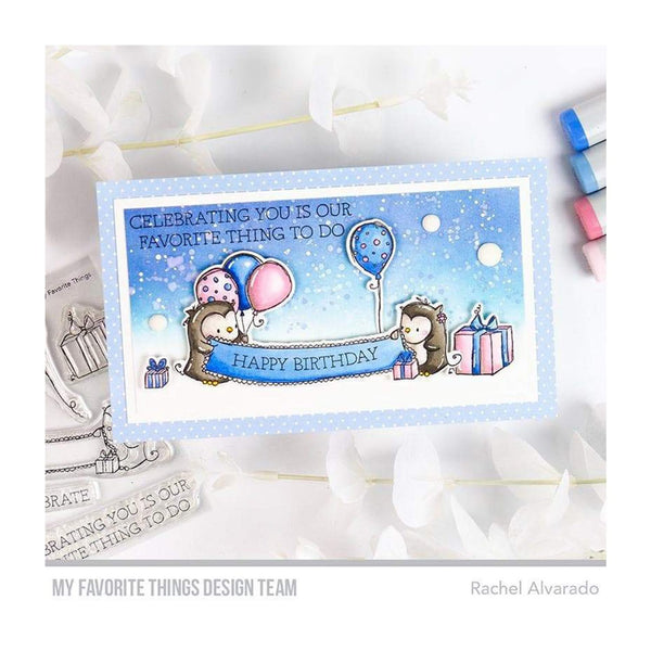 My Favorite Things Die-Namics Dies - Celebrating You. This die set coordinates with the Celebrating You stamp set (RAM-021, sold separately) for perfectly die-cut images. The dies are open inside to allow you to stamp then cut, or cut then stamp. This feature also allows for easier removal of the die cuts. Size: 4"x4", (4) piece set.