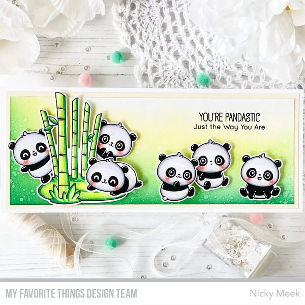 My Favorite Things Die-Namics Dies - Pandastic. What’s black and white and cute all over? Hands down, the Pandastic set fits this description to a T. This adorable crew can mingle together to create a sweet, cheery scene. A small bamboo grove complements the characters providing a spot for them to chill while aa array of sentiments will complete your message. This die set coordinates with the Pandastic stamp set (JB-058) for perfectly die-cut images, each sold separately. The dies are open inside to allow you to stamp then cut or cut then stamp. This feature also allows for easier removal of the die cuts. The dies are compatible with most die-cutting machines (sold separately). (7) piece set.