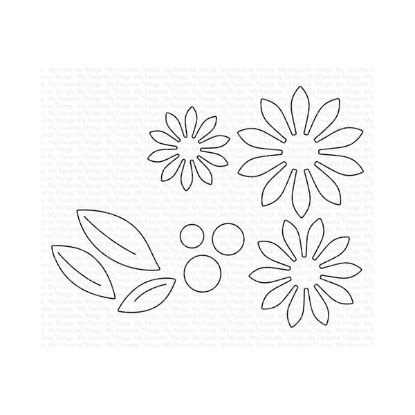 My Favorite Things Die-Namics Dies - Upsy-Daisy. Daisies are among the cheeriest flowers imaginable – their sunny disposition puts them at the top of the list! This versatile flower-building set includes a trio of petals, leaves, and flower centres to allow for complete customization of your daisy bouquets. A bold pop-art greeting with a single flower head replacing a letter is a surefire ticket to achieving an unforgettable look as well, though! The dies are compatible with most die-cutting machines (sold separately). (5) piece set. Size: Flower heads (3) 1 3/4", 1 1/2", 1 1/8"