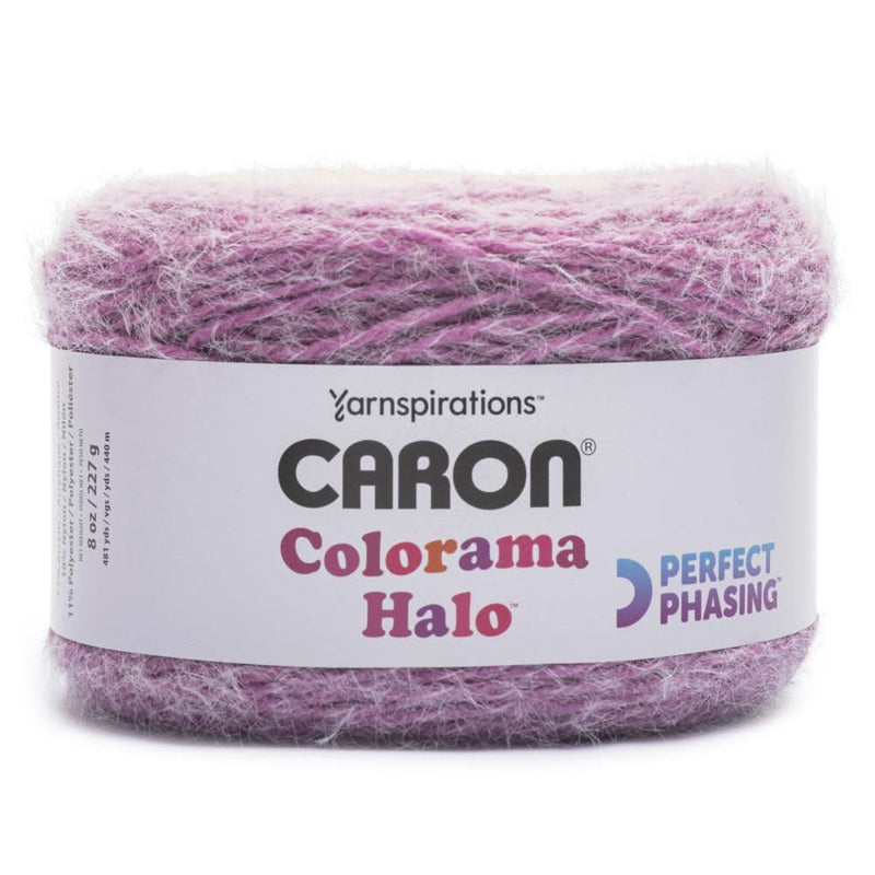 Caron Colorama Halo Yarn - Orchid Frost - Caron(r) Colorama Halo™, is the perfect yarn for both beginners and experienced crafters alike! This bulky-weight acrylic striping yarn easily creates beautiful, approachable fashion pieces. With its luxuriously soft and textured feel, possibilities are endless. Weight Category: 5. Content: 71% Acrylic/18% Nylon/11% Polyester. Put up: 8oz/227gr, 481yd/440m. Gauge: 15stX20r=4in/10cm on size US10/6mm knitting needles. Suggested crochet hook size: J10/6mm. Dyelotted: we try but are not always able to match dyelots. Available in a variety of colours. Each sold separately. Machine Wash Cold, Delicate/Gentle Cycle, Do Not Bleach, Tumble Dry Low Heat, Delicate/Gentle Cycle, Do Not Iron, Do Not Dry Clean.