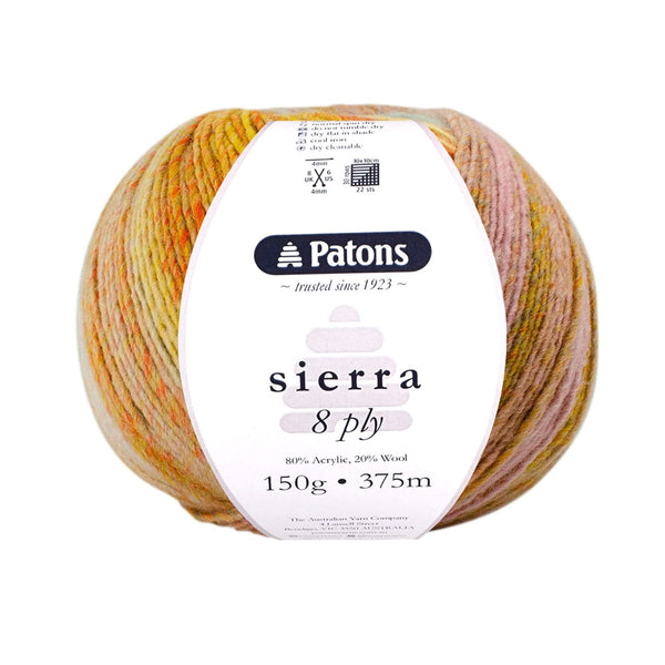 Patons Sierra Yarn 8ply 150g - Arizona. Our ideal transeasonal blend. Featuring a range of captivating prints and a substantial 150g doughnut ball, this yarn is a true winner!