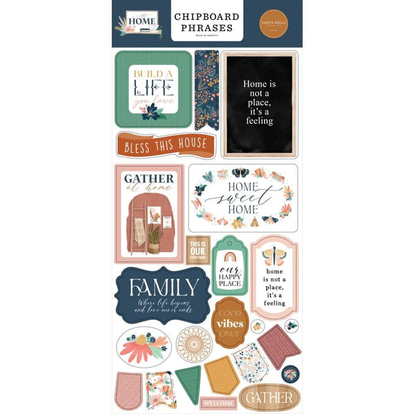 Carta Bella Chipboard 6"X13" Phrases, At Home - This sheet of Chipboard Embellishments, Phrases, is part of the At Home Collection from Carta Bella Paper. This chipboard sticker sheet includes frames and signs as well as banners with images and words and phrases. These stickers can be added to cards, scrapbook pages, tags, journals, and other paper crafting projects. This sheet of chipboard stickers is made in the USA.