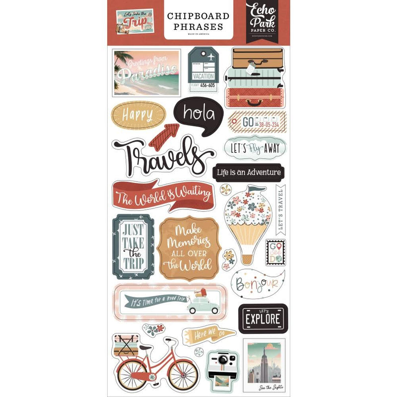 Echo Park Chipboard 6"X13" Phrases, Let's Take The Trip - While you need the perfect paper to start your project, you also need the perfect embellishment to finish your project! Embellishments can add whimsy, dimension, colour and style to greeting cards, scrapbook pages, altered art, mixed media and more. This package contains Echo Park Chipboard 6x13 inches.