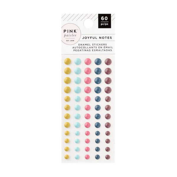 Pink Paislee Joyful Notes Enamel Dots 60/Pkg. Introducing Joyful Notes by Pink Paislee! Embrace the poetry of life, love, and celebration as your projects bloom with sentience and style. This collection is filled with an array of colour and gold foil throughout. Add some dimension to your projects with these enamel stickers! They're perfect for adding just the right amount of height to scrapbooks, cards, journals, planners, and so much more. This package contains 60 enamel stickers in a variety of colours and sizes.