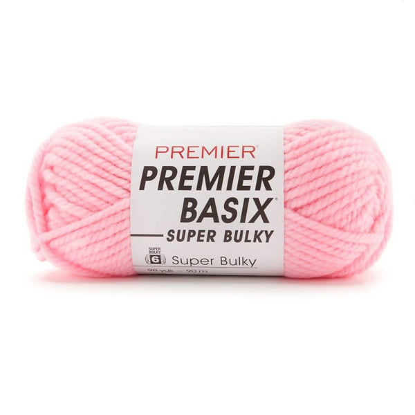 Premier Basix Super Bulky Yarn - Pink - This yarn will create soft and cuddly blankets, cute toys and more. This super bulky yarn works up quickly, making it perfect for quick gifts. Please purchase a sufficient quantity of one dye lot to ensure uniformity of color. Weight Category: 6. Content: 100% Acrylic. Put up: 5.29oz/150g, 98yd/90m. Gauge: 9s x 12r = 4in/10cm on size US 13/9mm knitting needles. Suggested crochet hook size: US M-13/9mm. Dyelotted: we try but are not always able to match dyelots. Available in a variety of colors. Each sold separately. Machine Wash Cold, Permanent Press, Do Not Bleach, Tumble Dry Low Heat, Permanent Press, Do Not Iron, Dry Clean.
