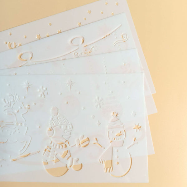 Poppy Craft Stencil Kit #55 - Christmas Collection - Christmas Scenes. Poppy Crafts stencils can be used with your favourite sprays, inks, paints, glitter pastes, texture pastes, embossing pastes, and other crafting mediums (sold separately) to create fun and creative images. These stencils clean up easily and can be used time and again. The set includes 4 stencils. Stencil Sizes: 13.8cm x 49.5cm.