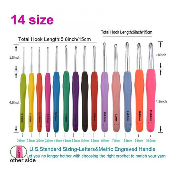 Poppy Crafts 14 Sizes Ergonomic Crochet Hook Set #2. This compact and portable kit makes it easy to carry and will not take up too much space. These crochet hooks have soft grip handles which makes them comfortable and easy to grip while working on all crochet projects. Every hook is marked with numbers and Letter, so you’ll never be confused. Crochet Hooks Size: 2.0mm, 2.5mm, 3.0mm, 3.5mm, 4.0mm, 4.5mm, 5.0mm, 5.5mm, 6.0mm, 6.5mm, 7.0mm, 8.0mm, 9.0mm, 10.0mm. Package Includes: 14 x Multi Coloured Crochet Hooks, 10 x Stitch Markers, 9 x Large-Eye Blunt Needles, 1 x Measuring Tape and 1 x Zip up Storage Case.