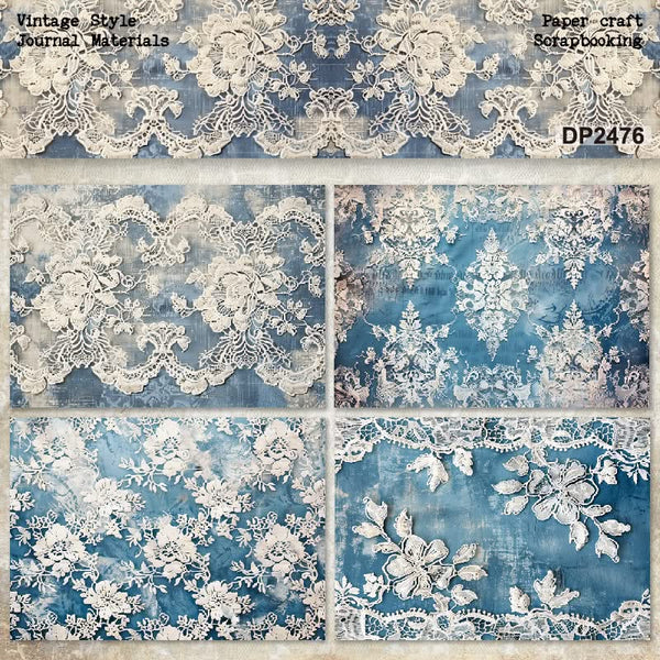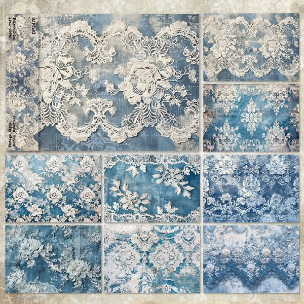 Poppy Crafts A5 Paper Pack #31 - Vintage Blue & White Lace. These scrap papers are perfect for scrapbooking, journaling, mixed media, card making, tags, traveller's notebooks, junk journals and so much more! Each pack consists of 8 pieces (8 designs, 1 each design). Available in a range of different designs, each sold separately. Single-sided paper. 160gsm. Approximate paper size: 14.4cm x 21cm