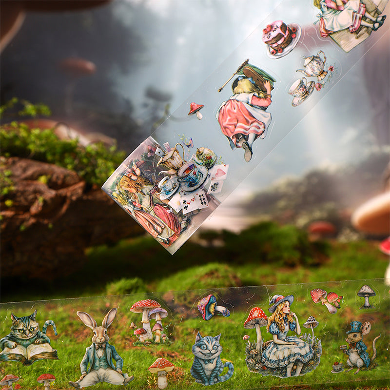 Add a touch of whimsical charm to your projects with the Alice's Circle of Close Friends PET sticker roll from Poppy Crafts. This enchanting collection showcases Alice alongside her Wonderland companions, including rabbits, cats, and mushrooms, in two beautifully illustrated rows. Crafted from durable, semi-transparent PET material, the 1-roll set measures 5cm × 200cm, ideal for journaling, scrapbooking, planners, and paper crafts. Perfect for layering, these stickers bring playful, sophisticated character accents to every creative layout.