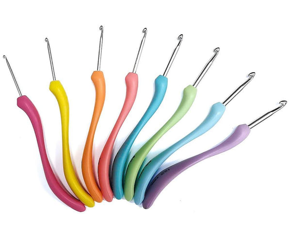 Poppy Crafts Crochet Hook Set #6 - Large Curved Grip. These large curved crochet hooks are comfortable and easy to grip while working on all crochet projects. Every hook is marked with the size, so you’ll never be confused. Crochet Hooks Size: 2.5mm, 3.0mm, 3.5mm, 4.0mm, 4.5mm, 5.0mm, 5.5mm, and 6.0mm. Package Includes: Eight Crochet Hooks.