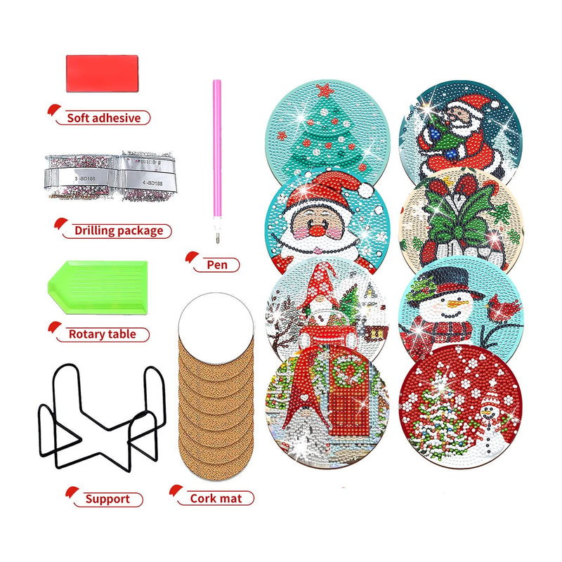 Poppy Crafts Diamond Coaster Kit #8 - Fun Christmas. Create something beautiful with Diamond-like facets that shimmer in the light. Using the stylus, simply pick up a facet and place it onto the sticky design surface. Nothing can prepare you for the spectacular sparkling result of your finished project! Suitable for ages 8-80. This package includes everything you need to create Eight beautiful coaster diamond paintings. It contains 8x coaster canvases, 1x coaster holder, Diamond Dots, one stylus, one diamond dot tray, and one wax caddy, providing all the necessary tools for your artistic creations. Coaster Size: 10cm x 10cm.