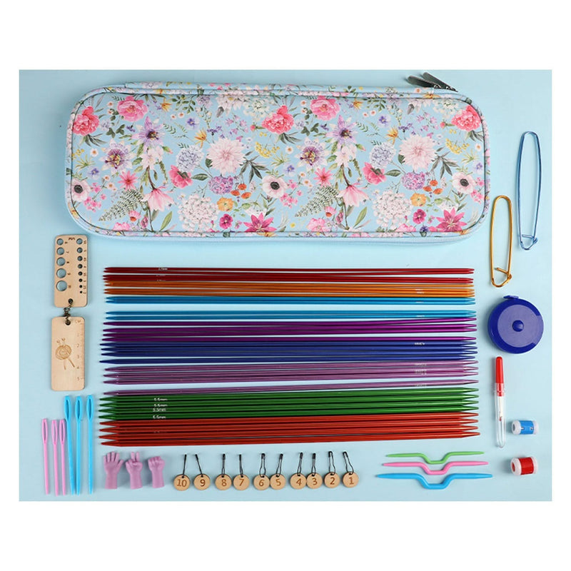 Poppy Crafts Knitting Needle Set #1 - Beautiful Blooms. The Poppy Crafts Knitting Needle Set is a complete kit for knitters of all levels. It includes 8 different sizes of durable metal needles (4 of each size), stitch counters, needle sizers, a small wooden ruler, a soft measuring tape, plastic needles, bent plastic needles, a pick, and charming little "hands" that sit on your knitting needles for added safety and style. Perfect for tackling any knitting project with ease and organisation! Case Size: 15cm x 39cm x 2.5cm.