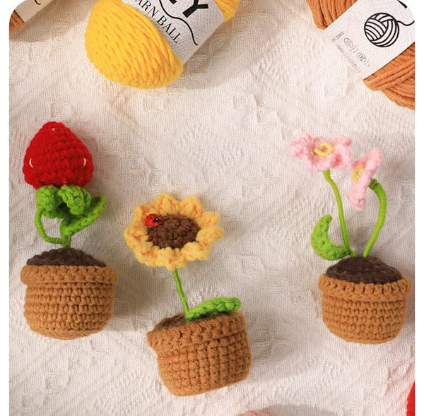 Poppy Crafts Learn to Crochet Kit #26 - Small Potted Flowers. These little flowers are so quick and easy to make, that you’ll be able to whip this up in no time! These crochet kits from Poppy Crafts includes everything you need. Complete with yarn, stuffing and embellishments, start crocheting today and soon you'll have some adorable little plant friends. This package contains Yarn, stuffing, hot glue stick, crochet hook, needles, stitch markers, wire, rocks for weighing down pots, ladybug embellishments, and instructions.