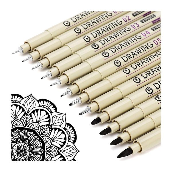 Poppy Crafts Fineliner Pens - Archival Black Ink 12 Pack. These pens are ideal for anime, illustration, cartooning, pen-and-ink drawing, scrapbooking, and other detail work. The pens use special pigment ink which makes them light-resistance, water-resistance, chemical-resistance, and no blooming in water. Artists, archivists, crafters, journal enthusiasts, students, and scientists alike trust Poppy Crafts Archival Black Ink Pens for all of their creative endeavours, archival-quality projects, and more. Set of 12 includes 1 each: LT-005, LT-01, LT-02, LT-03, LT-04, LT-05, LT-08, LT-10, LT-1, LT-2, LT-3, and LT-BR.