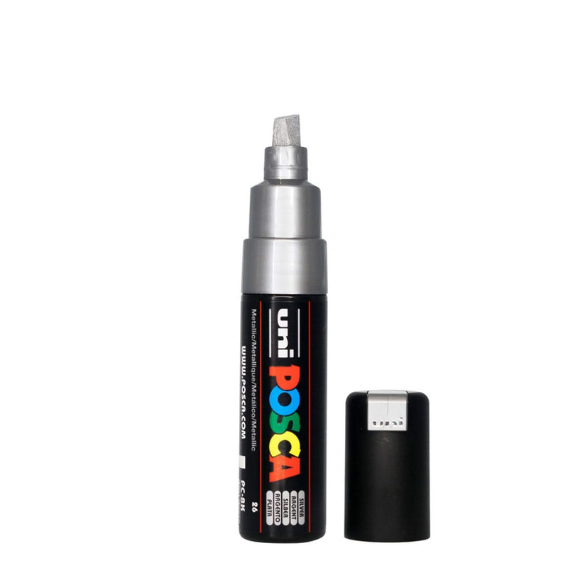 Uni-Ball POSCA Bold Chisel Tip Paint Marker Pen PC-8K - Silver. The Uni-Ball Posca Pen features a bold 8mm chisel tip loaded with highly pigmented, lightfast ink. This water-based ink is quick-drying, waterproof, and flows smoothly, allowing for easy writing on almost any surface. The ink is permanent on porous surfaces but can be removed from smooth surfaces like glass, metal, or plastic. Despite its dense and vibrant colour, it does not bleed through paper.