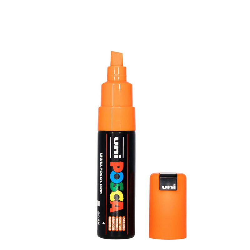 Uni-Ball POSCA Bold Chisel Tip Paint Marker Pen PC-8K - Orange. The Uni-Ball Posca Pen features a bold 8mm chisel tip loaded with highly pigmented, lightfast ink. This water-based ink is quick-drying, waterproof, and flows smoothly, allowing for easy writing on almost any surface. The ink is permanent on porous surfaces but can be removed from smooth surfaces like glass, metal, or plastic. Despite its dense and vibrant colour, it does not bleed through paper.