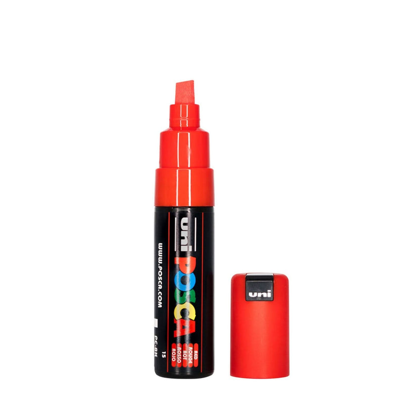 Uni-Ball POSCA Bold Chisel Tip Paint Marker Pen PC-8K - Red. The Uni-Ball Posca Pen features a bold 8mm chisel tip loaded with highly pigmented, lightfast ink. This water-based ink is quick-drying, waterproof, and flows smoothly, allowing for easy writing on almost any surface. The ink is permanent on porous surfaces but can be removed from smooth surfaces like glass, metal, or plastic. Despite its dense and vibrant colour, it does not bleed through paper.