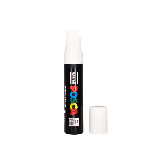 Uni-Ball POSCA Broad Tip Paint Marker Pen PC-17K - White. The Uni-Ball Posca Pen features a broad 15mm tip loaded with highly pigmented, lightfast ink. This water-based ink is quick-drying, waterproof, and flows smoothly, allowing for easy writing on almost any surface. The ink is permanent on porous surfaces but can be removed from smooth surfaces like glass, metal, or plastic. Despite its dense and vibrant colour, it does not bleed through paper.