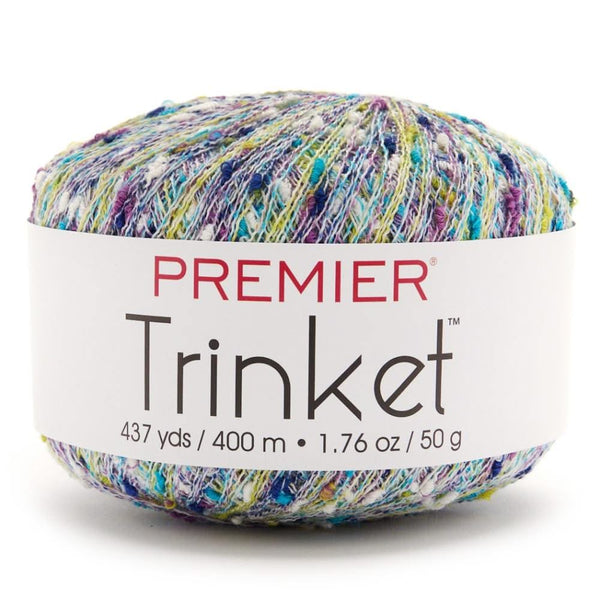 Premier Trinket Yarn - Sapphire. Yarn Adds that extra something special that we can't resist. Trinket is a super fine weight strand adorned with multi-coloured fibre bits, which when carried along with any yarn transforms projects into textured treasures. Nine colours to choose from allow for endless interesting possibilities. Weight Category: 1/ Super Fine. Content: 100% Polyester. Put Up: 1.76 oz/ 50g, 437 yds/400 m. Gauge: 28sX40r = 4in/10cm on size US size 3 (3.25mm) knitting needles. Suggested crochet hook US size D-3 (3.25mm). Dyelotted: we try but are not always able to match dyelots. Care: Machine wash warm. Do not bleach. Tumble dry, normal. Do not iron. Dry clean any solvent. Comes in a variety of colours. Each sold separately.