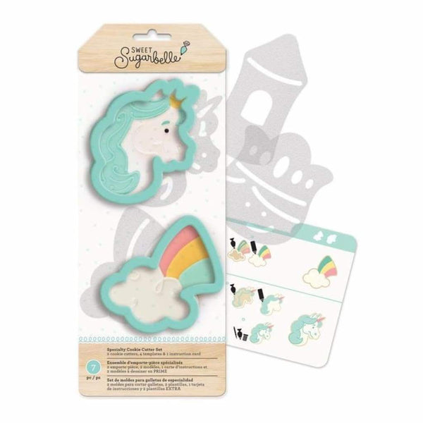 Sweet Sugarbelle -Specialty Cookie Cutter Set: This specialty cookie cutter set makes cookie decorating easy! Cookie cutters are dishwasher safe.Pack includes 2 cookie cutters 2 templates Instruction card and 2 Bonus templates.Generous sized shape cutters.Unicorn shaped cutter measures approx 4.25 x 3 inchesRainbow shaped cutter measures approx 3.75 x 2.5 inches