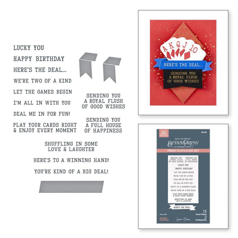 Spellbinders Better Press Plates By Jaycee Gaspar Shuffling Sentiments - Shuffling Sentiments Press Plate & Die Set is part of the Jack of All Trades Collection by Jaycee Gaspar. This versatile set includes 13 sentiment plates that mix and match seamlessly with any of the sets in the collection. Two thin metal cutting dies are included to create a dimensional ribbon-tail banner, perfect for highlighting the sentiments in your projects. Ink the plates with BetterPress Ink to achieve a crisp letterpress design on BetterPress Cotton Card Panel and Sheets. Using the system is simple and professional results are achieved in just four steps. Place the BetterPress Press Plate onto the Chase (a magnetic platform designed to hold the press plate). Tape the Card Panel onto the Platen (a clear top plate with registration marks), apply ink to the Press Plate, and then make a Letterpress Sandwich. Run it through a manual die-cutting machine to produce detailed impressions with a tactile finish. This set offers endless creative possibilities, whether for crafting unique stationery, creating ribbon-tail banners, or even adding personal touches to playing cards.
