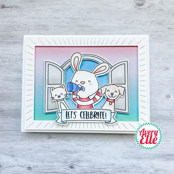 Avery Elle Elle-ments Dies - Shout It Out - This five piece Elle-Ments die set, Shout It Out, is from Avery Elle. This die set coordinates with the Shout It Out stamp set (sold separately) and cuts out the rabbit holding the megaphone, a banner, a party hat, and a star. These dies are compatible with leading die cutting machines (sold separately). These dies can be used on cards, scrapbook pages, tags, and other paper crafting projects. The largest die measures 2.5" x 1.93" and the smallest die measures 0.37" x 0.37".
