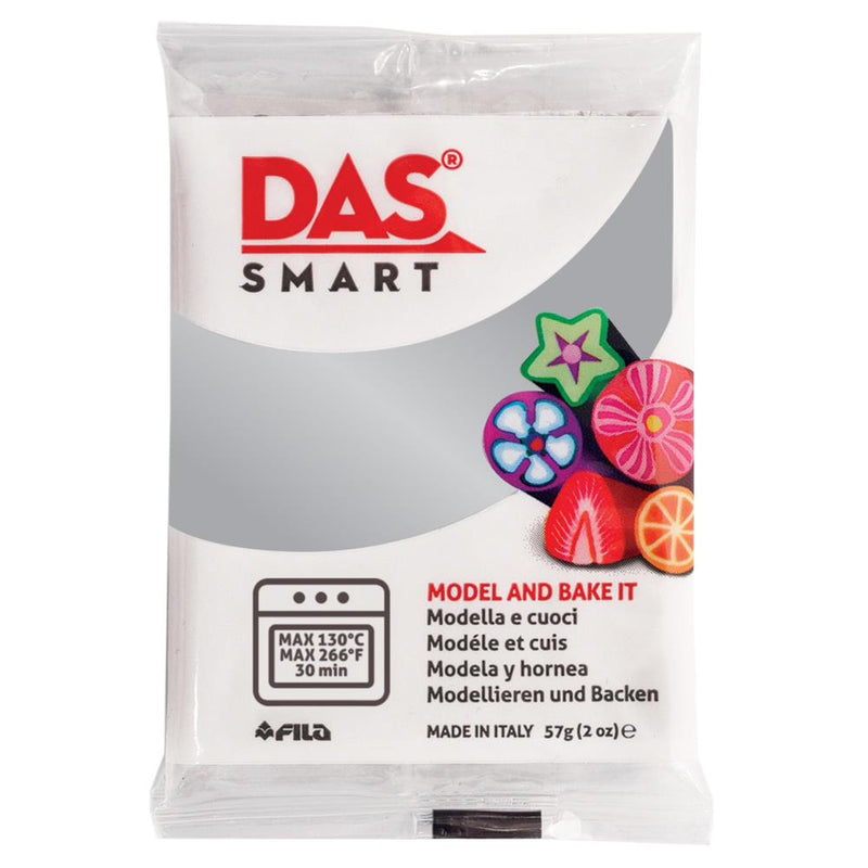 DAS Smart Oven Hardening Clay 2oz - Silver - Easy to manipulate, with a compact and versatile structure, DAS Smart is the new PVC-based oven-hardening clay that does not stain your hands. It is ideal for making murrine, creating jewels and small artifacts. Bake in a 130C oven for up to 30 minutes, but objects can be cooked several times to add new details. The 57g. block is packed in an innovative pack consisting of 2 single-sealed packs, specially designed for convenience and better preservation; it is available in 45 colours, lively and modern, all of which can be combined.