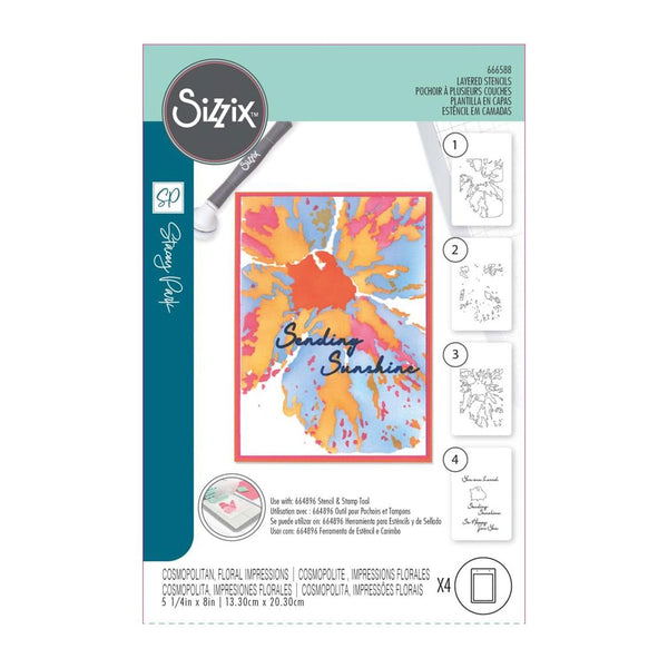 Sizzix A6 Layered Cosmopolitan Stencils By Stacey Park 4/Pkg - Floral Impressions. Floral Impressions by Stacey Park creates a bold, exaggerated floral design that is sure to make a real impact on all your craft projects. The layered stencil includes three different sentiments suitable for any occasion but can be masked off easily to only include the phrase you wish to use. Includes 4 stencils. Design Dimensions 5 ¼” x 8”.