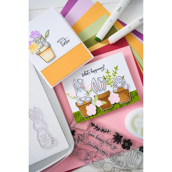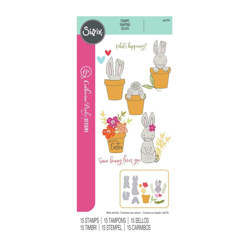 Sizzix Clear Stamps Set By Catherine Pooler 15/Pkg - Bunny Bits & Blooms. Hop into spring with the delightful Clear Stamps Set 15PK – Bunny Bits & Blooms by Catherine Pooler! This charming 15-piece stamp set is packed with adorable bunnies, blossoming florals, and playful accents that will bring a touch of whimsy and warmth to your paper crafting projects. Whether you're creating Easter cards, spring-themed scrapbook pages, or whimsical designs for any occasion, this set is perfect for adding sweet, nature-inspired details to your work. Let your creativity bloom with each stamp, and bring a little joy to every project! This stamp set works perfectly with the Framelits Die Set 17PK – Bunny Bits & Blooms #2 (666795) and make sure to pair with the Sizzix Stencil & Stamp Tool (664896) for perfect precision every time, all sold separately. Approximate Design Size: 1 1/4” x 3 3/8” - 1/2” x 1/2” (3.18cm x 8.57cm - 1.27cm x 1.27cm).
