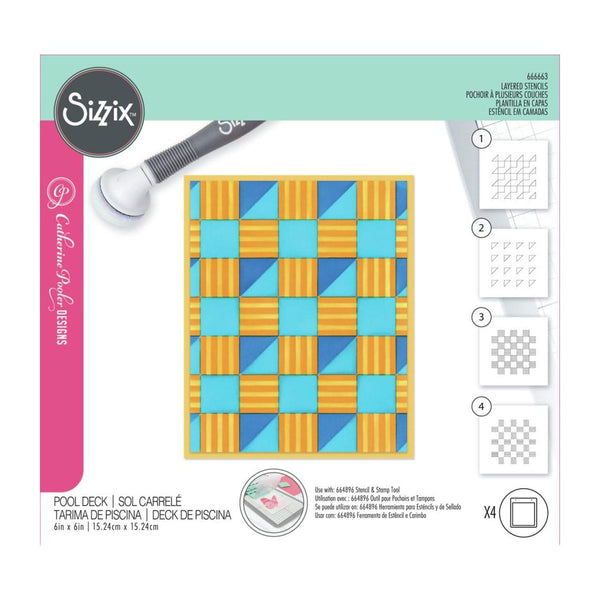 Sizzix Layered Stencils By Catherine Pooler 4/Pkg - Pool Deck. This four Layered Stencil set is ideal for creating geometric backgrounds, not only for vacation theme makes, but all year round. Build up all four 6"x6" layers to create the ultimate detailed design, or mix and match the stencils or use singularly to create a whole host of different effects. Pair with the Sizzix Stencil & Stamp Tool (664896, sold separately) for best results. Approximate Design Size: 6” x 6” (15.24cm x 15.24cm).