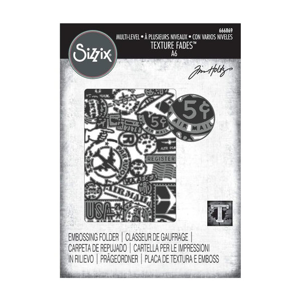 Sizzix Textured Impressions Embossing Folder by Tim Holtz - Vault Airmail. The sky’s the limit with the Multi-Level Textured Impressions Embossing Folder—Vault Airmail by Tim Holtz, designed to bring dimension and realistic textures to a variety of surfaces including cardstock, paper, vellum, and metallic foil. Featuring a charming vintage postage and stamp pattern, this embossing folder captures the essence of world travel and exploration—allowing you to create unique pieces that evoke a sense of adventure and nostalgia. Whether you're sending a heartfelt message or decorating your living space, this vault release embossing folder is your passport to creativity. Approximate Design Size: 6 1/4” x 4 1/4” (15.88cm x 10.80cm).