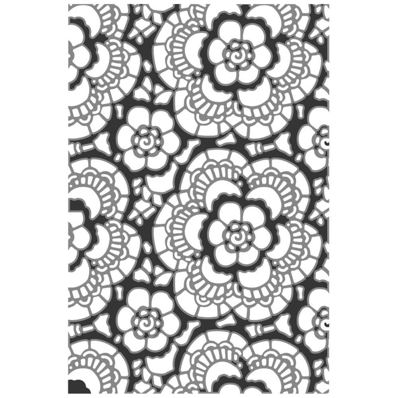 Sizzix Textured Impressions Embossing Folder by Tim Holtz - Vault Lace. Bring a touch of elegance and sophistication to your creations with this Multi-Level Textured Impressions Embossing Folder - Vault Lace by Tim Holtz. Featuring an exquisite overall lace pattern, this embossing folder showcases delicate details that will transform your cards, home décor projects and more into stunning works of art. Whether you’re looking to enhance invitations, cards, scrapbook pages or DIY décor, this folder offers the perfect solution for adding dimension and realistic textures to a variety of surfaces, including cardstock, paper, vellum and metallic foil. Approximate Design Size: 6 1/4” x 4 1/4” (15.88cm x 10.80cm).
