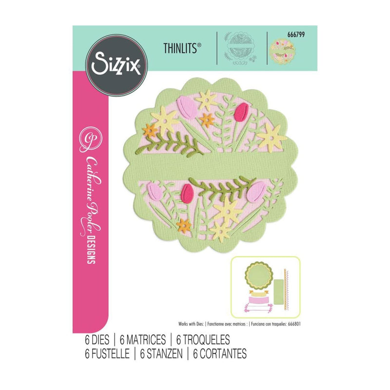 Sizzix Thinlits Die Set By Catherine Pooler 6/Pkg - Tulips & Blooms Circle. Bring your paper crafting to life with the Tulips & Blooms Circle Thinlits Die Set by Catherine Pooler! This 6-piece die set features a stunning floral design, combining delicate tulips and blooming flowers in a circular frame. Perfect for creating elegant focal points, custom embellishments, and layered designs, these dies make it easy to create a spring-inspired masterpiece, a birthday greeting, or a heartfelt note. The soft floral motifs and circular shape create a timeless, sophisticated look that will shine through every craft you create. This die set works perfectly with the Thinlits Die Set 10PK – Scalloped Circles, Borders & Banners (666801, sold separately).*Requires Sizzix Accessory - Chrome Precision Base Plate For Intricate Thinlits Dies (660470) (except when using the Big Shot Foldaway), all sold separately. Approximate Design Size: 3 1/2” x 3 1/2” - 1 3/4” x 1/2” (8.89cm x 8.89cm - 4.45cm x 1.27cm).