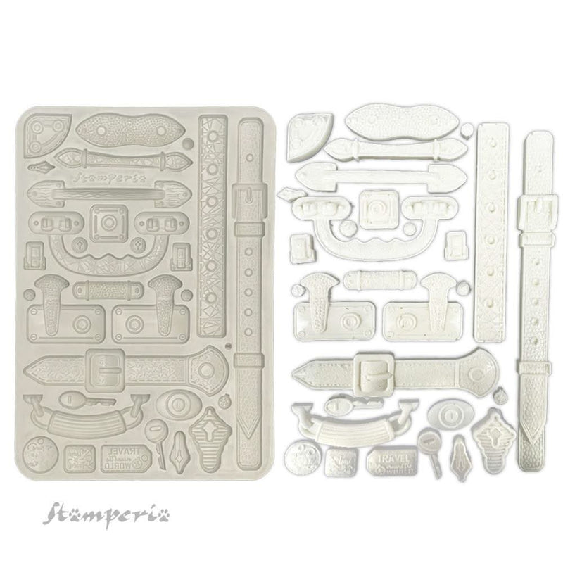 Stamperia Silicone Mold A5 - Art of Travelling - Belts And Handles. These moulds will work perfectly with all your scrapbooking and paper-crafting projects! The base keeps the mould suspended and perfectly level, making it easy to use with liquid products like Crystal Resin or liquid Gesso, sold separately. Ideal for Soap, Ceramic Powder, and White Resin and for all products to be moulded by pressure or to be cold-cast. Size A5 (14.8cm x 21cm).