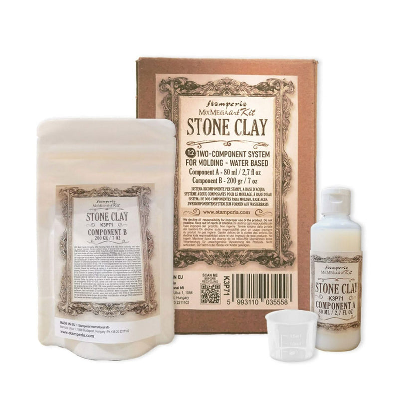 Stamperia Stone Clay Set 80ml + 200g. Introducing a remarkably durable, water-based clay. Simply mix the two components and pour into molds, molds sold separately. The results are stunning—precisely detailed and elegantly coloured, reminiscent of carved stone.