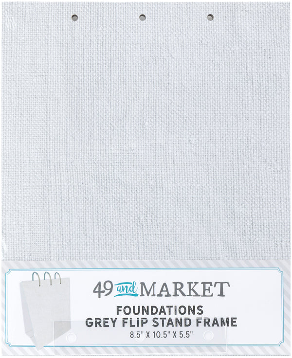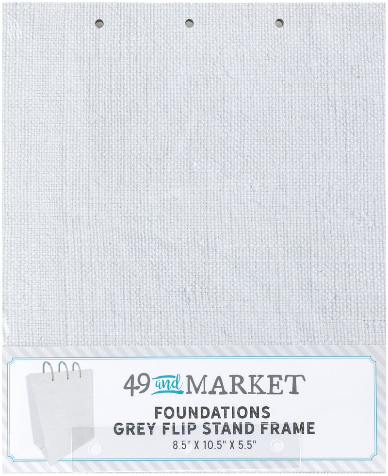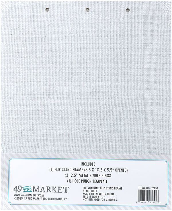 49 And Market Foundations Flip Stand Frame Grey - Display your favourite memories and creations with the 49 and Market Grey Foundations Flip Stand Frame. This 8.5 x 10.5-inch free-standing chipboard frame features a neutral grey canvas pattern that complements any style. The set includes three 2.5-inch metal binder rings and a hole punch template, making it easy to assemble and showcase photos, artwork, or scrapbook pages in an interactive, flip-through format.