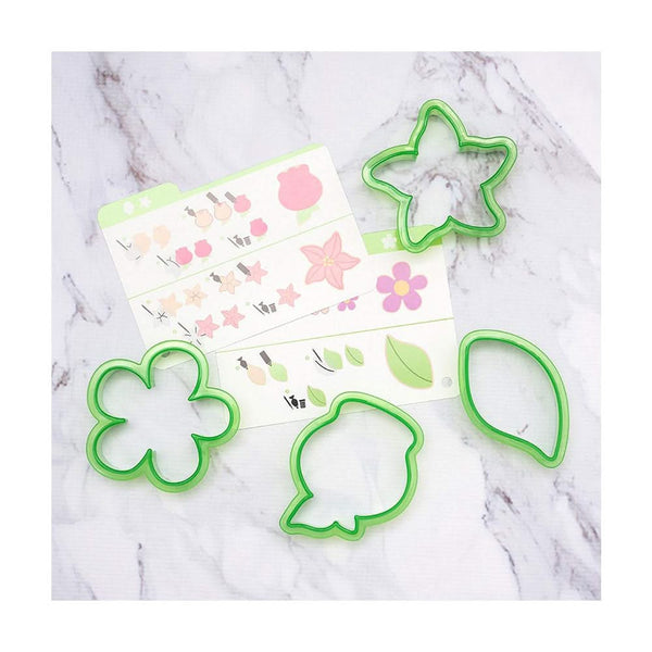 Create an assortment of spring cookie platters with these four "shape shifting" cookie cutters. This 6.875x7.5x1.125 inch package contains four cookie cutters in three different flowers and a leaf, eight templates to add decorations to the flowers and two instruction cards. Cookie cutters are dishwasher safe, clean templates with a damp cloth.