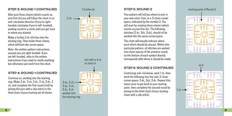 Includes a 32-page booklet with guides on reading charts, colour planning, joining techniques, and more. All squares use the same yarn and hook size - ideal for easy assembling.