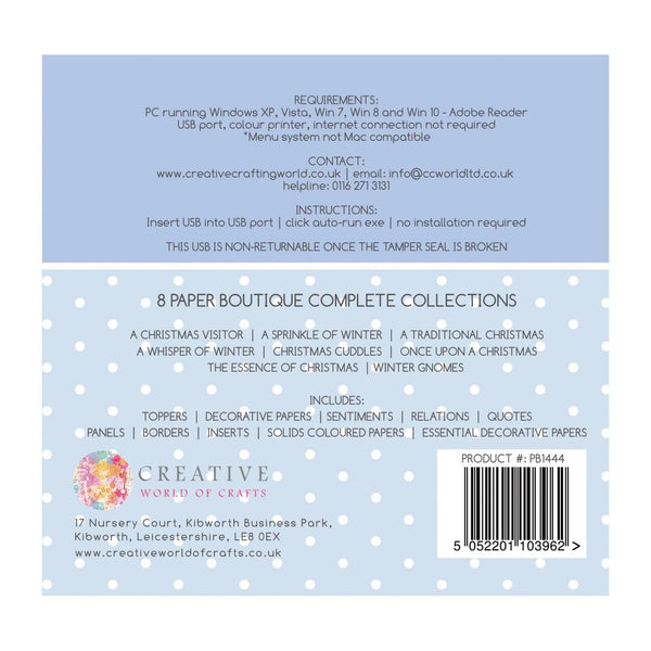 The Paper Boutique Paper Pantry Vol 3 – USB Collection featuring eight popular Christmas Collections with a great mix of festive styles. In excess of 900 printable sheets! The Collections are – A Whisper of Winter Collection, A Sprinkle of Winter Collection, Once upon a Christmas Collection, A Traditional Christmas Collection, A Christmas Visitor Collection, The Essence of Christmas Collection, Winter Gnomes Collection, Christmas Cuddles Collection. Contents of each collection: – Square Toppers, Circle Toppers, 8” x 8” Decorative Papers – 6 designs, 8” x 8” Embellishment Papers – 6 designs including borders, sentiments, toppers, quotations and relations, Inserts – 10 designs, Coloured Papers – 8 Colours. Essential Decorative Papers – 8 designs – 8 colours for each design. In addition to the designs which were included in the printed paper collections an Essential Papers section has been added for each of the individual collections. This has 8 designs of papers which are a staple requirement in most crafter’s stash: checks, stripes & dots etc. Each of the essential papers comes in the 8 colours from the coloured paper section. There is a full Angel Policy on the USB. The USB has an easy to use interface which gives visual thumbnails for every printable sheet. No having to jot down file names or having to click through hundreds of files to find a suitable image. Within each of the 8 design sets everything mixes, matches and complements the piece of artwork. The files on the USB can be accessed by MAC users. The USB is viewed through Adobe Reader which is a piece of software which is available free to download.