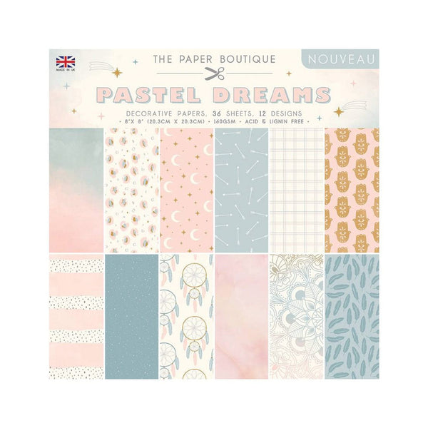 The Paper Boutique - Pastel Dreams 8"×8" Paper Pad. The images are dreamcatcher- inspired in a lovely soft palette with a spiritual feel to them. 8 x 8 pad with 36 sheets in 12 designs, in 160 gsm paper. The range contains a versatile selection of decorative paper pads in three sizes, a project pad full of a huge variety of images ready to be cut apart for cards, scrapbook pages and other paper projects, double-sided solid colours, buttons, bows, wooden tags, sequins, photo frames, gems and pearls, each sold separately. Acid and lignin free.