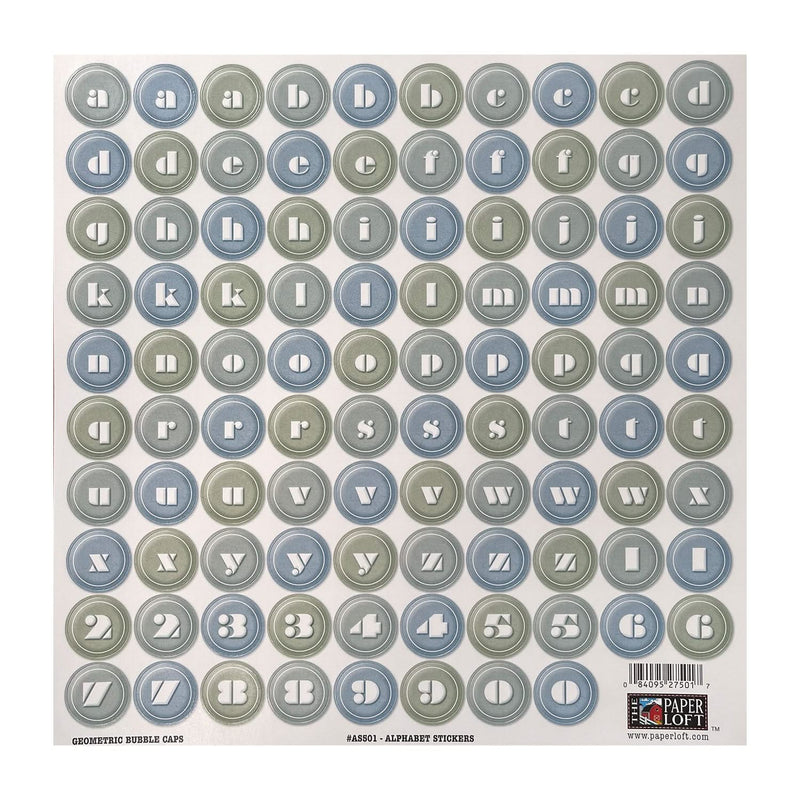 The Paper Loft 12"x 12" Cardstock Alphabet Stickers - Geometric Bubble Caps #1. This package contains one 12" x 12" (30.5cm x 30.5cm) sheet of cardstock alphabet stickers, numbers and punctuation marks.